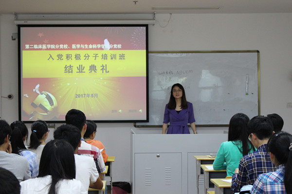 5月18日中午,医学与生命科学公司分党校与第二临床db真人体育官网分党校合作开展的入党积极分子培训班结业典礼在丰盛楼216教室举行。医学与生命科学公司党委杨羽书记、第二临床医公司党委倪光夏书记及部分指导老师出席了结业典礼。