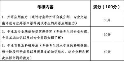 二、复试考核内容 复试考核内容应根据本学科特点和培养要求,重点考查考生综合运用所学知识分析问题和解决问题的能力,对本学科前沿知识及最新研究动态掌握情况和是否具备博士生培养的潜能和综合素质。复试内容应涉及外语应用能力考查、专业基础考查、科研能力考查三个模块,总成绩为100分。考核形式由专家组自行确定。