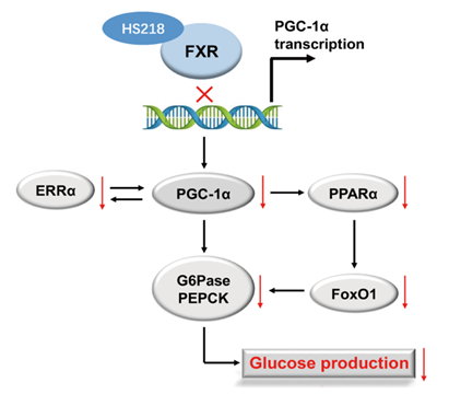 FXR是胆汁酸代谢平衡的主要调控因子,近年来也被发现与糖代谢密切相关。研究表明,在动物水平激活FXR可降低小鼠的血糖及糖异生基因的表达,在细胞水平激活FXR可通过SHP抑制糖异生关键调控因子HNF4及FoxO1的活性,从而抑制糖异生。然而,对于拮抗FXR是否会抑制肝糖异生,目前依然存在一些争议。基于这一现状,研究人员开发了一种FXR特异性小分子拮抗剂HS218,并发现HS218可通过抑制肝糖异生、降低肝糖输出,进而改善db/db小鼠及HFD/STZ小鼠的血糖平衡。此外,利用HS218作为探针分子,对FXR调控糖异生的机制进行了深入探究。首次发现HS218可拮抗FXR与糖异生调控关键因子PGC-1α启动子的结合,进而抑制PGC-1α的活性,并降低其下游糖异生相关调控因子PPARα的转录;HS218对PPARα的抑制还可进一步激活AKT-FoxO1通路,以达到改善肝糖代谢的目的。该项研究成果为靶向FXR开发新型肝糖异生抑制剂提供了重要思路,同时为2型糖尿病的病理机制的进一步阐明提供了重要素材。