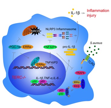 众所周知,年龄影响机体免疫系统的功能和炎症反应状态。与年轻人相比,老年细菌性肺炎的发病率和死亡率均显著增加,其潜在机制有待阐明。端粒是染色体末端的DNA序列,对维持人类基因组的稳定至关重要。细胞每分裂一次,端粒就缩短一次,当端粒不能再缩短时,细胞就无法继续分裂而死亡。因此,端粒被称作“生命时钟”,端粒损伤与衰老相关疾病有关,但端粒功能障碍与感染、免疫和炎症有何关系仍有许多未解之谜。最近,DB视讯史丽云教授研究团队在国际期刊Cell Reports刊发了关于“端粒功能失调干扰巨噬细胞线粒体代谢和NLRP3炎症小体活化”的研究论文。 该项研究中,研究者利用端粒酶敲除小鼠肺部感染金黄色葡萄球菌的实验模型,研究了端粒功能缺陷对机体免疫和炎症的影响。研究发现,与对照小鼠相比,端粒酶敲除小鼠尽管仍保留有清除病原菌的能力,但其肺部表现出更为强烈的炎症反应和病理损伤,生存率显著下降。进一步的研究表明,端粒功能失调影响巨噬细胞线粒体的形态、结构和功能,使其发生能量代谢失衡。大量释放的线粒体ROS引发NLRP3炎症小体通路的活化和巨噬细胞过度应答,可能是造成端粒缺损小鼠严重病理损伤的重要原因。
