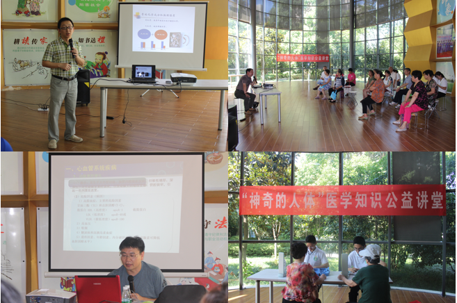 “神奇的人体”医学知识公益讲堂在栖霞区香樟园小区开展。“仁爱薪火”社团邀请公司专家教师在小区会所,为居民开设公益讲座3场,内容涉及“人体的结构与奥秘”、“老人常见疾病预防与保健”、“重要人体器官保健”等相关内容,帮助市民了解医学保健知识、提升健康生活水平。讲座的同时,社团的同学们还提供量血压、推拿等公益服务,在社区居民中引起了极大的反响及好评。