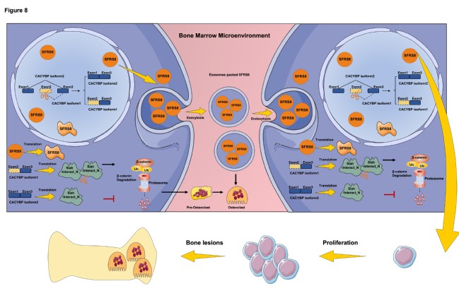2022年2月20日,Wiley旗下国际著名学术期刊Clinical and Translational Medicine在线发表公司杨烨、顾春艳教授课题组题为“Splicing factor arginine/serine-rich 8 promotes multiple myeloma malignancy and bone lesion through alternative splicing of CACYBP and exosome-based cellular communication”的文章。本文首次报道了RNA剪接因子SFRS8促进MM进展的新机制,主要通过介导钙周期素结合蛋白CACYBP的选择性剪接,即减少CACYBP isoform1 (NM_014412.3) 而增加CACYBP isoform2 (NM_001007214.1),进而影响β-catenin的泛素化降解途径。机制研究发现SFRS8可以在体内外通过外泌体促进破骨细胞分化,表明基于外泌体的细胞通讯可以促进MM的进展和骨病变。更重要的是,载有CACYBP isoform2 siRNA的外泌体有效地抑制了PDX和SCID/NOD-TIBIA骨髓瘤模型小鼠的肿瘤生长。该研究揭示了靶向SFRS8/CACYBP/β-catenin轴是MM诊断和治疗新的策略,同时外泌体作为其靶向药物或抑制剂的载体具有广阔的发展前景。博士研究生张园娇为该论文的第一作者,博士研究生余夕潮、孙榕泽,硕士研究生闵捷为共同第一作者,杨烨教授、顾春艳教授、滕乐生教授为共同通讯作者。该研究获得国家重点研发计划(2020YFA0509400)、江苏省优秀青年科学基金项目(BK20200097)、江苏省高等公司重点学科发展(中西医结合)基金、江苏省研究生科研创新计划项目(KYCX20_1451)等项目资助。