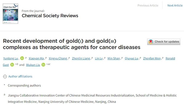 近日,db真人体育官网•整合医学公司刘武昆课题组在化学一级学科顶级期刊Chemical Society Reviews (IF:54.564)上在线发表了综述论文“Recent development of gold(I) and gold(III) complexes as therapeutic agents for cancer diseases”。