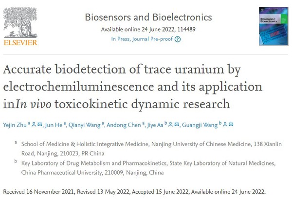 近日,db真人体育官网•整合医学公司,药理系青年教师朱业锦博士,联合中国药科大学王广基院士和阿基业研究员在国际知名学术期刊 Biosensors & bioelectronics (中科院1区TOP期刊,IF:10.618) 上发表学术论文“ Accurate Biodetection of Trace Uranium by Electrochemiluminescence and Its Application in In Vivo Toxicokinetic Dynamic Research ”。朱业锦博士为该论文第一作者和通讯作者,DB视讯是第一单位。原文链接:https://www.sciencedirect.com/science/article/abs/pii/S0956566322005292