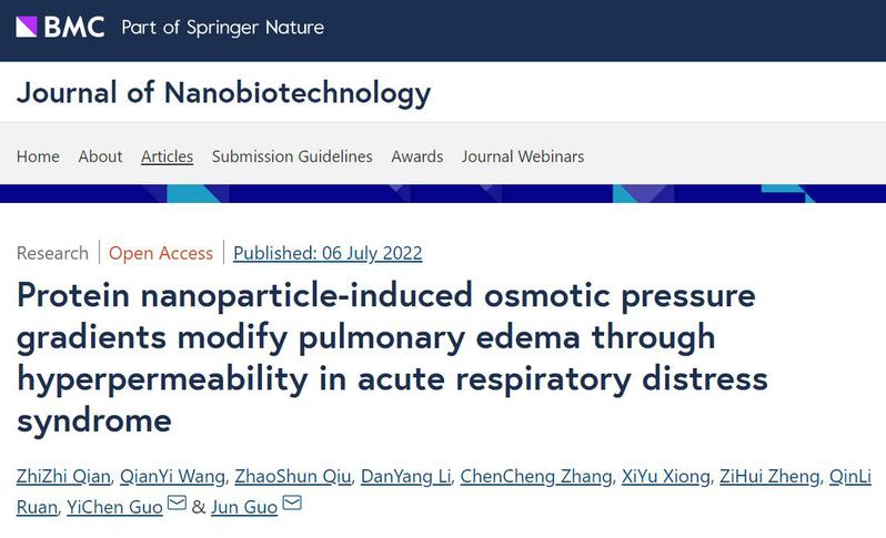 近日,db真人体育官网•整合医学公司郭军教授团队在Journal of Nanobiotechnology期刊 (IF: 10.435) 上在线发表了最新研究成果“Protein nanoparticle-induced osmotic pressure gradients modify pulmonary edema through hyperpermeability in acute respiratory distress syndrome”的论文。郭军教授为责任通讯作者,该研究获得国家自然科学基金和中药学一流学科开放课题资助。