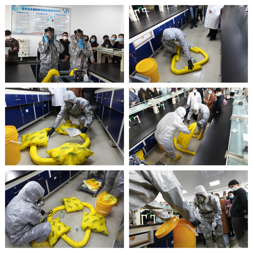 活动正式开始后,先是由国资处邀请的危化品专家老师向全体师生详尽介绍危化品泄露后正确的应对方法和处置措施,并详细阐述了危化品相关知识。随后,在专家老师的一声号令下,现场演练正式开始。参演师生模拟了“实验室内浓盐酸泄漏”的事故。浓盐酸泄漏后,现场人员有序撤离、及时封锁现场并评估危害、有序上报事故,应急救援人员在做好个人防护的基础上,及时消除危险源、恢复现场,并对事故进行仔细的调查与评估。整个演练过程中,参与人员分工明确、环节紧凑,严格按照流程执行,顺利完成演练活动,达到了预期的效果。
