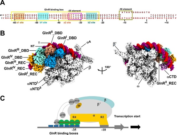 图1. 结核分枝杆菌GlnR依赖型转录激活复合物的冷冻电镜结构。 A. GlnR激活的下游靶标基因启动子DNA scaffold; B. GlnR依赖型转录激活复合物结构;C. GlnR激活下游靶标基因转录的模型。