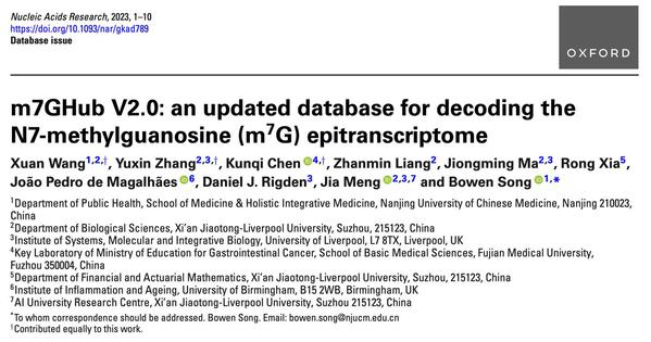2023年10月,db真人体育官网•整合医学公司公共卫生学系宋博文课题组在国际知名学术期刊Nucleic Acids Research(中科院生物一区,2022 IF=14.9)在线发表了题为“m7GHub V2.0: an updated database for decoding the N7-methylguanosine (m7G) epitranscriptome”的研究论文。该工作全面收集并解析了基于高通量测序以及第三代纳米孔测序技术得到的N7-methylguanosine(m7G)甲基化位点的定位、调控及潜在的发病机制,并构建深度学习模型探究单核苷酸多态性位点(SNP)与m7G甲基化写入(write)/抹除(erase)的动态关联。