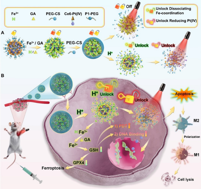 中药富含多种功能化合物,具有复杂的药理作用机制,明确中药的药效药理等命运变化过程是中药功能化合物研究的前沿热点。db真人体育官网齐若谷教授团队运用超分子化学原理,将光动力激活的铂类药物与多酚类中药没食子酸联合,创新设计构建出高聚物离子锁螯合前药分子探针,实现中药成分的分子水平精准作用机制,展示了中药成分与传统化疗药物结合后刺激巨噬细胞极化并诱发铁死亡的光动力过程,为中药功能化合物的开发提供了新的思路和方法。该研究论文“Sequential dual-locking strategy using photoactivated Pt(IV)-based metallo-nano prodrug for enhanced chemotherapy and photodynamic efficacy by triggering ferroptosis and macrophage polarization”发表于Acta Pharmaceutica Sinica B(IF=14.5)。