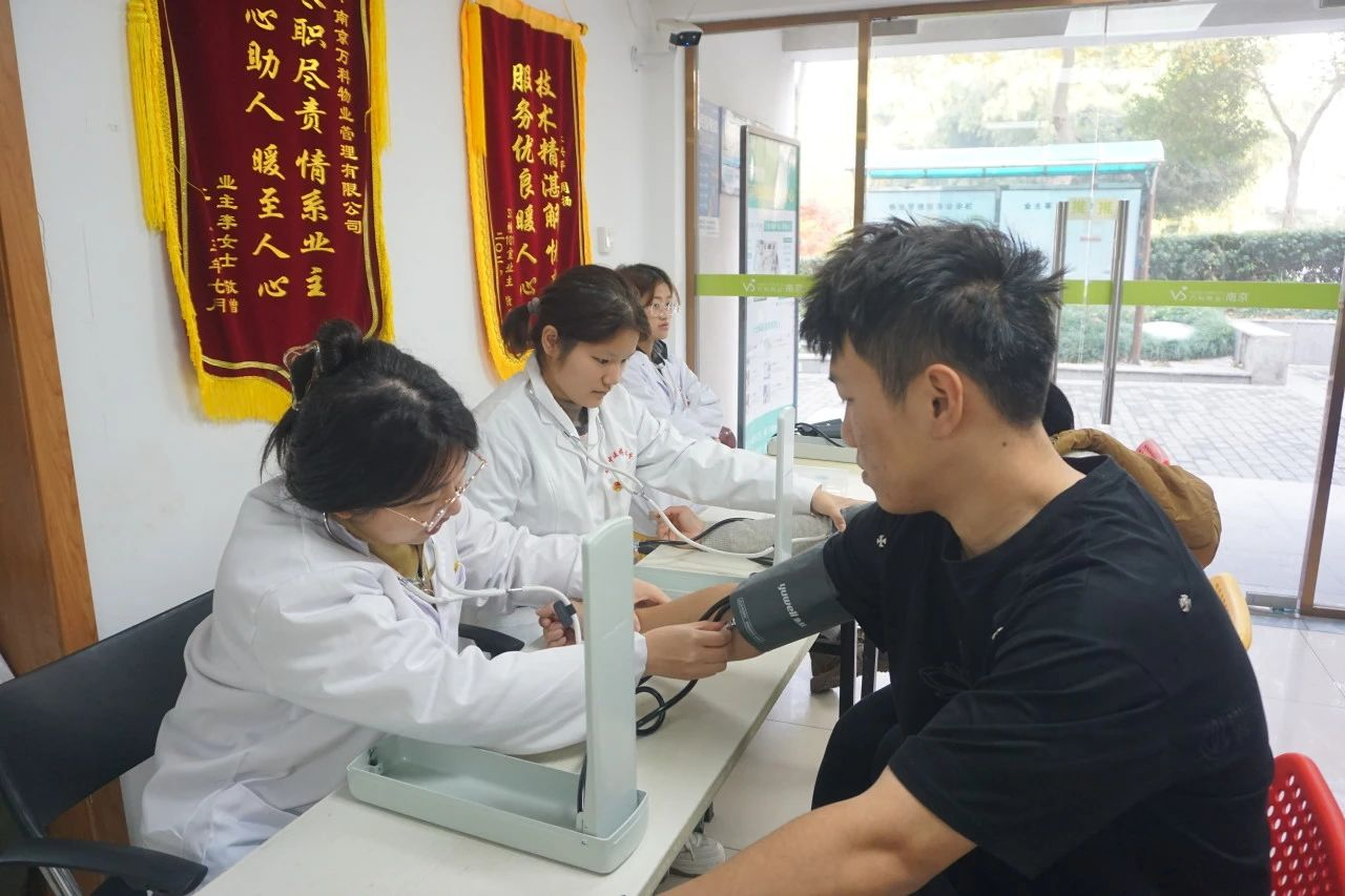 另一边,志愿者们热情地为居民们测量血压,耐心询问居民们的健康状况,为居民们提供一些强身健体的建议。