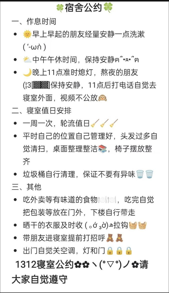 “此寝此景”宿舍规章分享会同样收获满满。活动期间,同学们积极响应,提交了各自宿舍的规章制度。这些规章涵盖了作息时间、卫生值日、学习互助、物品摆放等多个方面,细致且实用。有的宿舍规定了每晚11点准时熄灯,保证大家充足睡眠,以良好状态迎接新一天的学习;有的详细划分了卫生清洁区域,让宿舍始终保持整洁干净;还有的宿舍建立了学习小组制度,互相监督、共同进步。