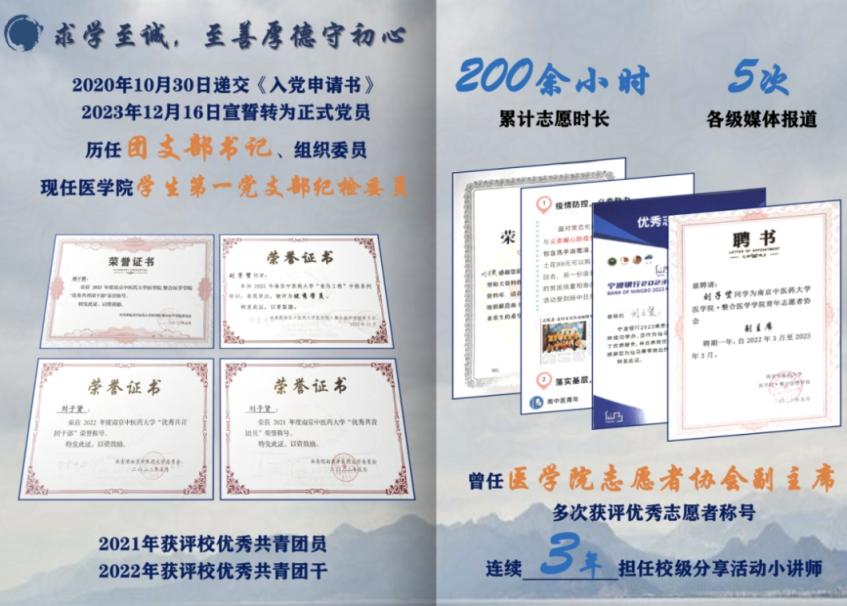 秉“学贯中西,至精至诚”,求“突破进取,全面发展”。刘子贤同学在学业、科创、员工工作、志愿实践、体育运动等各方面辛勤耕耘,脚踏实地,志存高远,在青春的征程上奋勇前进,谱写属于新时代医学学子的崭新篇章!