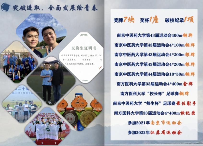 文明其精神,野蛮其体魄。作为校田径队的一员,他代表公司参加了第二十届江苏省运动会和南京市运动会。在校运会中,他已累计获得五枚奖牌。在南方医科大学期间,斩获金牌一枚,并打破校纪录。此外,他曾获南方医科大学足球院赛季军、南中医师生杯足球赛“最佳射手”等荣誉。