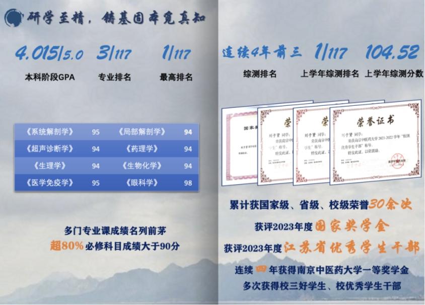 研学至精,公司的每一个角落都留下了他学习的身影。四年以来,他时刻激励自己刻苦钻研学业,奋力夯实医学基础,诸多专业课程取得高分。本科期间平均绩点排名专业第三,学年平均绩点最高排名专业第一。流水争先,更争滔滔不绝。他连续四年综测排名专业前三,上学年排名专业第一。