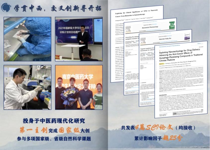 他积极投身中医药现代化研究,自大二暑期起他便跟随db真人体育官网齐若谷教授开始了在实验室的学习。在此期间,他参与了多个研究项目,共发表SCI论文4篇,累计影响因子超25分。其中以第一作者发表一篇中科院二区SCI文章,IF=8.0;以共同第一作者发表一篇中科院一区SCI文章,IF=8.7分。在齐若谷教授和张正光老师的指导下,他作为第一主创负责了一项国家级老员工创新创业项目,并顺利结题。