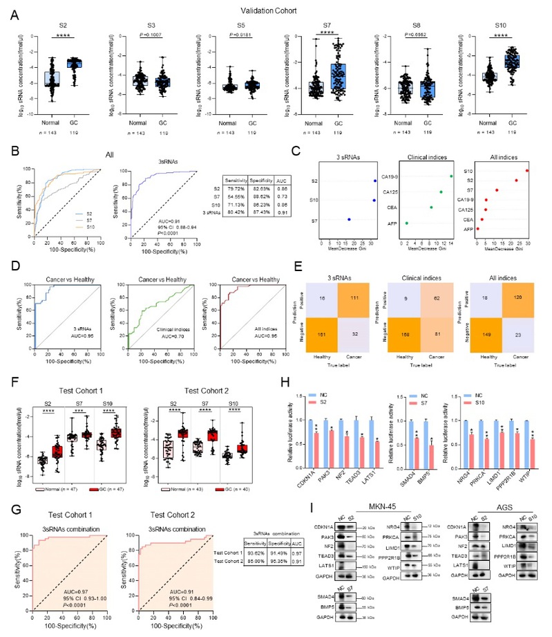 该研究利用PANDORA-seq全景测序技术,有效克服了RNA修饰干扰,首次在血浆外泌体中系统分析了两类非经典小RNA——rsRNA和tsRNA的分子图谱,发现3种rs/tsRNA组成的分子组合在早期胃癌中表现出优异诊断效能,功能研究发现这些rs/tsRNA通过调控ErbB/Hippo信号通路参与胃癌进展。该研究建立了基于外泌体来源的非经典sncRNAs的胃癌早期诊断模型,为液体活检提供了新思路。