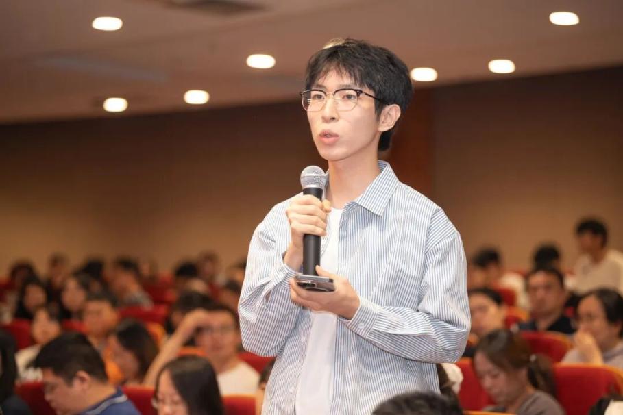 在交流互动环节,同学们踊跃提问。郭院士结合自身科研生涯中的攻坚经历勉励同学们:“在遇到实验瓶颈时,首先要沉下心坚持,学会主动思考,唯有在坚持与思考的碰撞中,才能孕育出新的科研成果。”王奎峰博士针对同学们关心的创业风险问题分享了感悟,强调在“在创业的道路上,保持冒险精神、乐观自信及坚韧性的重要性。”