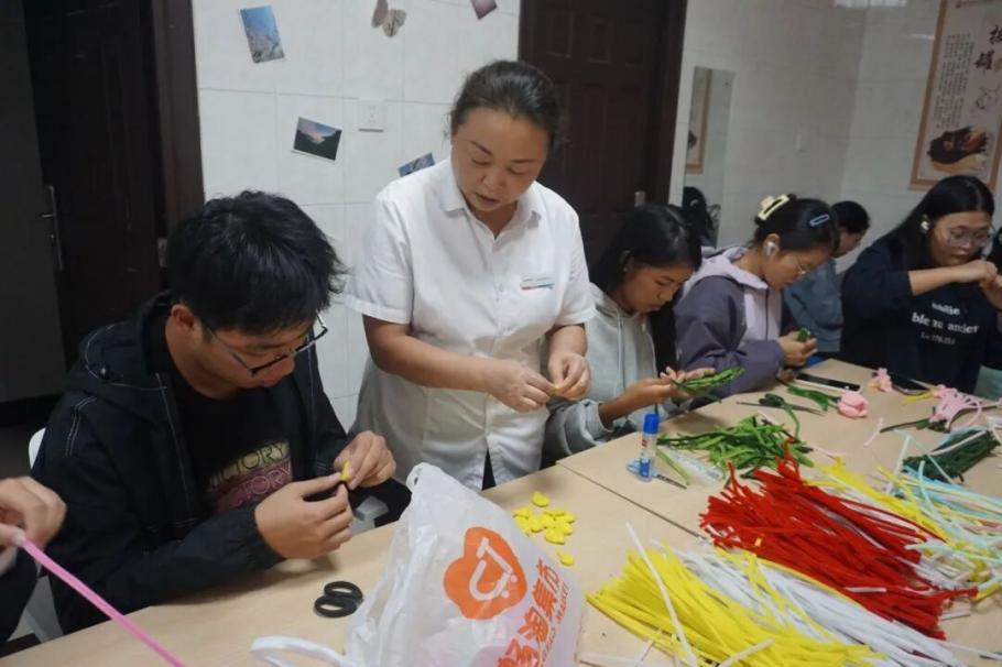 活动伊始,社区内便被五彩的毛线、灵巧的钩针、柔软的扭扭棒和同学们洋溢的笑容点亮。在舒缓的音乐中,同学们在手工达人的耐心指导下,从零开始学习钩织技巧,从最初的生疏逐渐变得熟练,专注的神情在脸上绽放。一针一线,仿佛将外界的喧嚣都隔绝开来,沉浸在手工的乐趣之中。掌握基本技巧后,同学们更是灵感迸发,开始了自由创作,钩针与毛线在指尖翩翩起舞,扭扭棒也变幻出各种造型,展现着同学们无限的创造力。