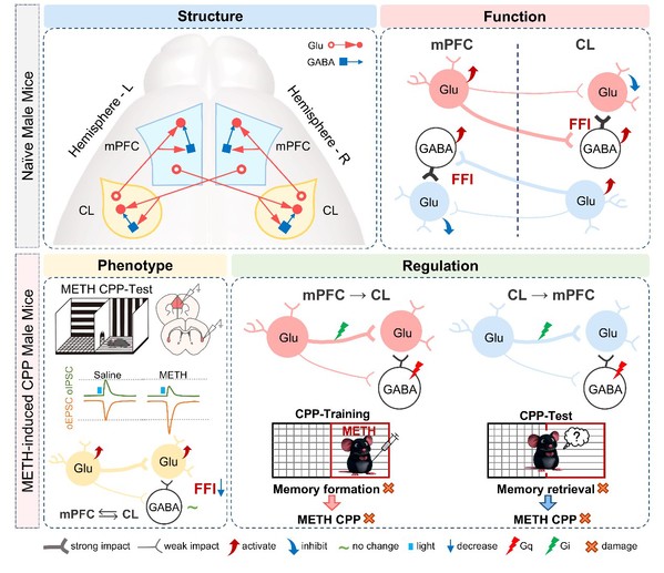 研究发现,内侧前额叶皮质(Medial prefrontal cortex,mPFC)与屏状核(Claustrum,CL)之间存在两条功能迥异却又紧密协作的通路:一是自上而下的mPFC→CL通路,主要负责大脑双侧半球间的信息整合;二是自下而上的CL→mPFC通路,主要承担同侧半球内的信息传递。这两条通路均包含直接的兴奋性投射与经由与GABA能中间神经元的间接抑制性投射。在生理状态下,局部GABA能神经元对谷氨酸能神经元施加精确的前馈抑制,维持环路兴奋/抑制平衡;然而在甲基苯丙胺(Methamphetamine,METH)作用下,这种抑制性调控显著减弱,导致下游兴奋性神经元过渡激活,破坏环路稳态。更重要的是,研究明确了这两条通路在METH奖赏记忆形成与表达中的时序性分工:在训练阶段,mPFC→CL通路主要负责METH奖赏与环境线索关联的编码与巩固;而在测试阶段,CL→mPFC通路则主要参与METH相关成瘾记忆的提取。这项研究不仅系统刻画了mPFC-CL神经环路的连接架构与功能特性,也为理解METH成瘾中奖赏记忆的神经环路机制提供了新的理论依据。