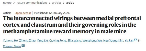 2026年1月12日,db真人体育官网关晓伟教授和范宇副教授团队在Nature子刊Nature Communications(中科院一区/JCR Q1,IF:15.7)发表题为“The interconnected wirings between medial prefrontal cortex and claustrum and their governing roles in the methamphetamine reward memory in male mice”的研究论文。
